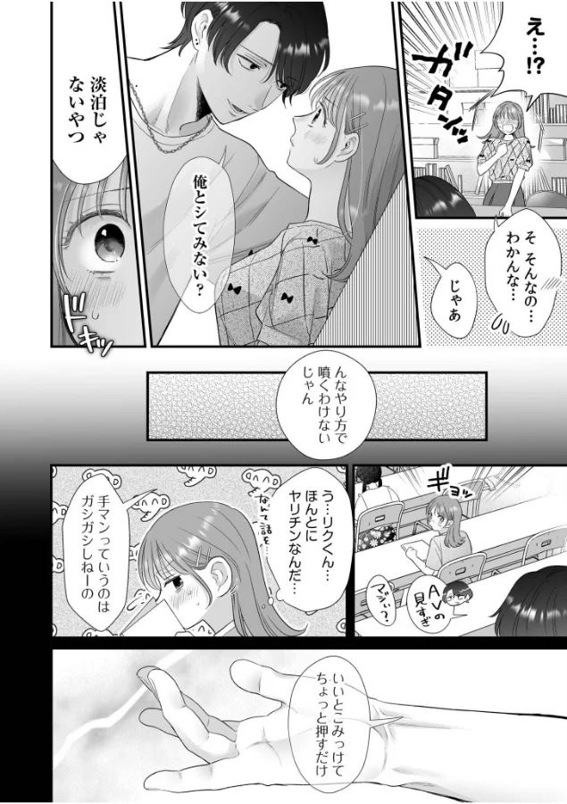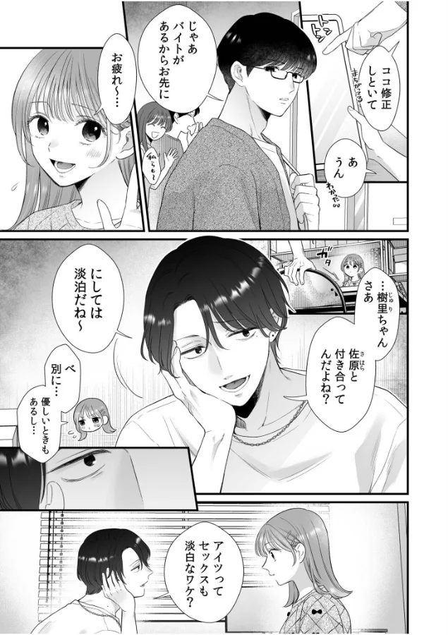 樹里と栄太郎は付き合っていますが、栄太郎の冷めた対応が樹里の心の隙間を日々広げていました。そんなある日、同期のリクが樹里に「俺とシてみない?淡白じゃないやつ」と迫っていきます。彼氏以外の男の指が優しく樹里の中に入り、気持ちいいところを刺激するのです……。